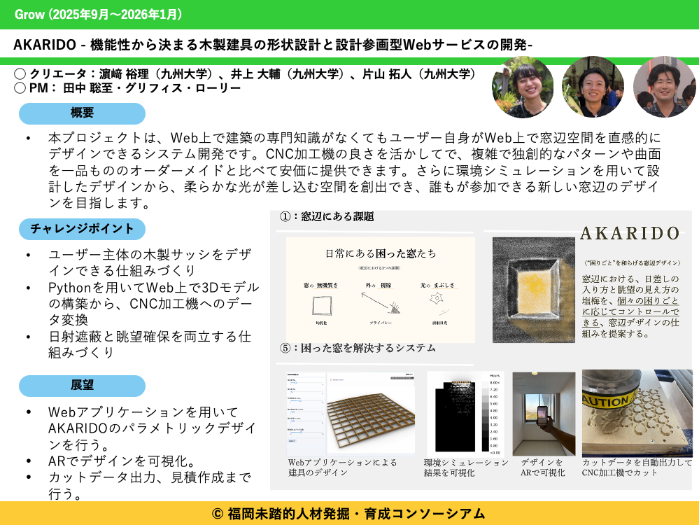 本プロジェクトは、建築の専門知識がなくてもWeb上で誰もが直感的に窓辺空間をデザインできるシステムの開発です。CNC加工により複雑な形状や独創的なパターンを1点もののオーダーメイドと比べて安価に実現します。さらに環境シミュレーションによって柔らかな光が降り注ぐ空間を創ることが可能です。ユーザー主体の新しい窓辺のデザインを目指します。