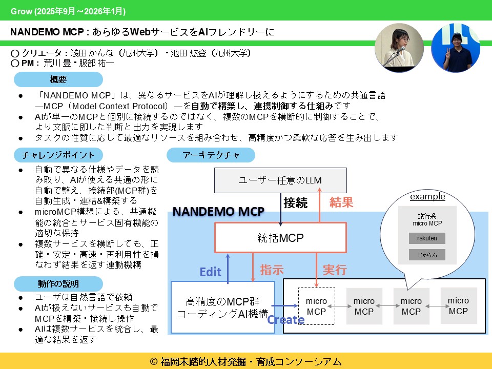 「NANDEMO MCP」は、異なるサービスをAIが理解し扱えるようにするための共通言語―MCP(Model Context Protocol)―を自動で構築し、連携制御する仕組みです。
