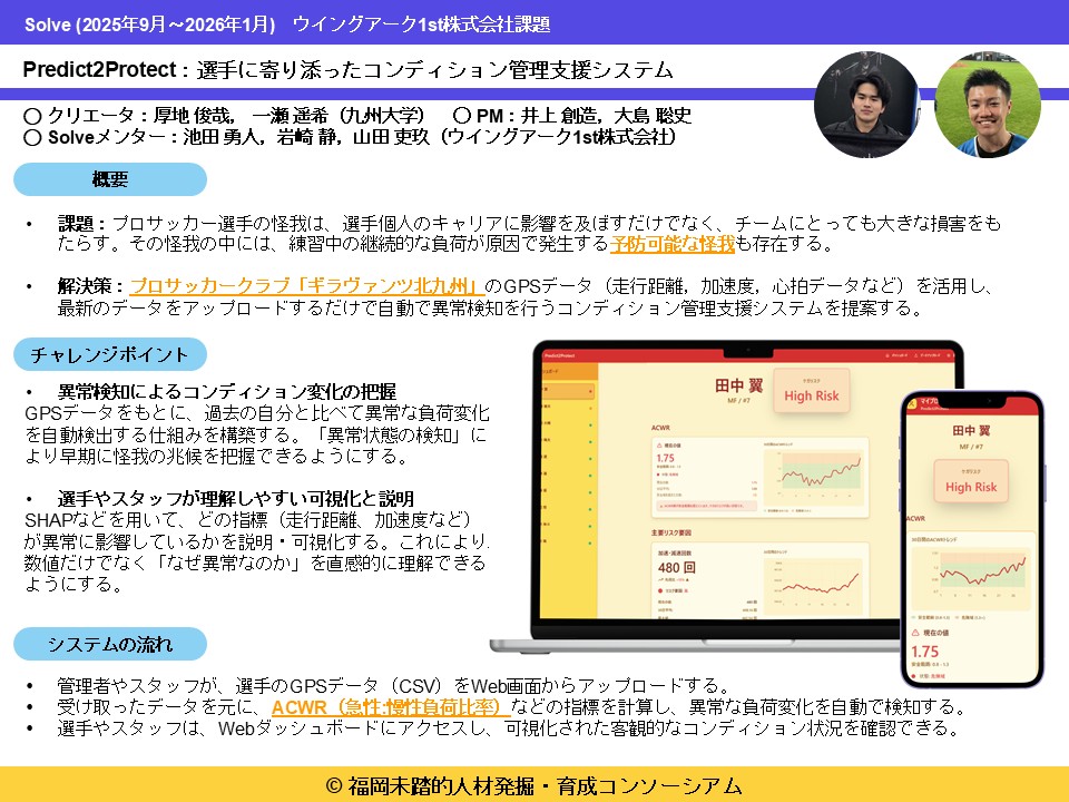 本プロジェクトでは、プロサッカークラブ「ギラヴァンツ北九州」のGPSデータを活用し、選手のコンディション変化を定量的に把握する支援システムを開発する。過去データと比較して異常な負荷を自動で検知し、選手やスタッフが早期に変化へ気づき、怪我の兆候を未然に防ぐシステムの実現を目指す。