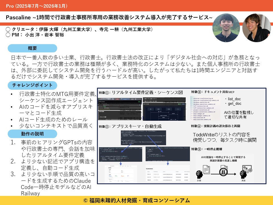 Pascalineは、「専門業務を扱う行政書士個人事務所」に「1時間エンジニアと対話するだけで事務所専用システム開発・導入」を「行政書士特化のAI駆動開発プラットフォーム」によって提供する。