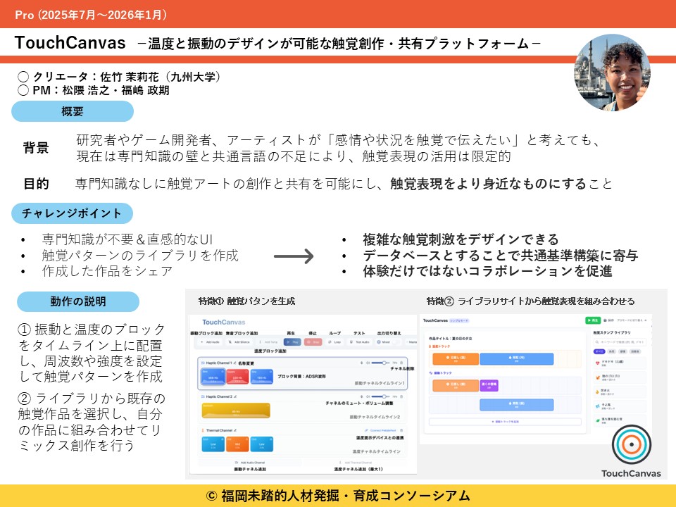 Touch Canvasは、温度と振動を組み合わせた触覚表現を自由に創作・共有できる、世界初の触覚創作プラットフォームです。PC上で直感的なインターフェースを使い、温度パターンと振動を組み合わせて触覚をデザインし、ゲームコントローラなどのデバイスを通じて体験できます。創作した触覚作品は他のユーザーと共有可能で、アート表現、ゲーム開発、研究用途など幅広い分野での活用を目指しています。